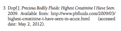 Extremely high levels of serum creatinine have been reported in the literature.3 The highest level of serum creatinine reported was 37 mg/dL.3So what is the highest previous creatinine reported in the literature? Well according to the author, Said Abuhasna, it's 37 from this post at PBFluids. Nice to see blogs being included in the canon of medical literature. Though it would be even nicer if they spelled my name right.