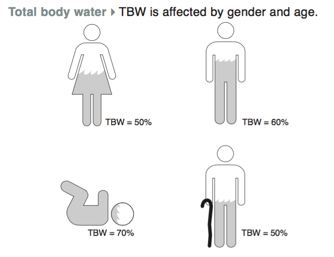 Everyone knows the rule of thumb that young males are 60% water, young females are 50% water and the percent body water falls as people age or get fatter.
